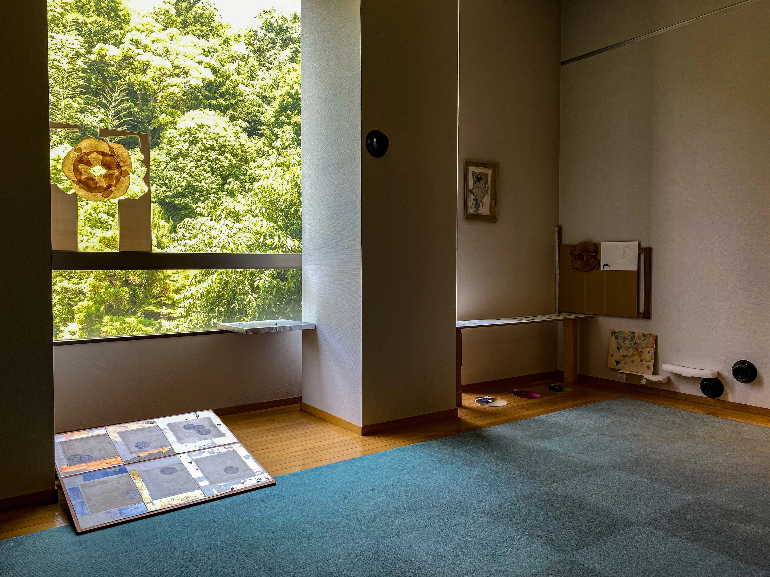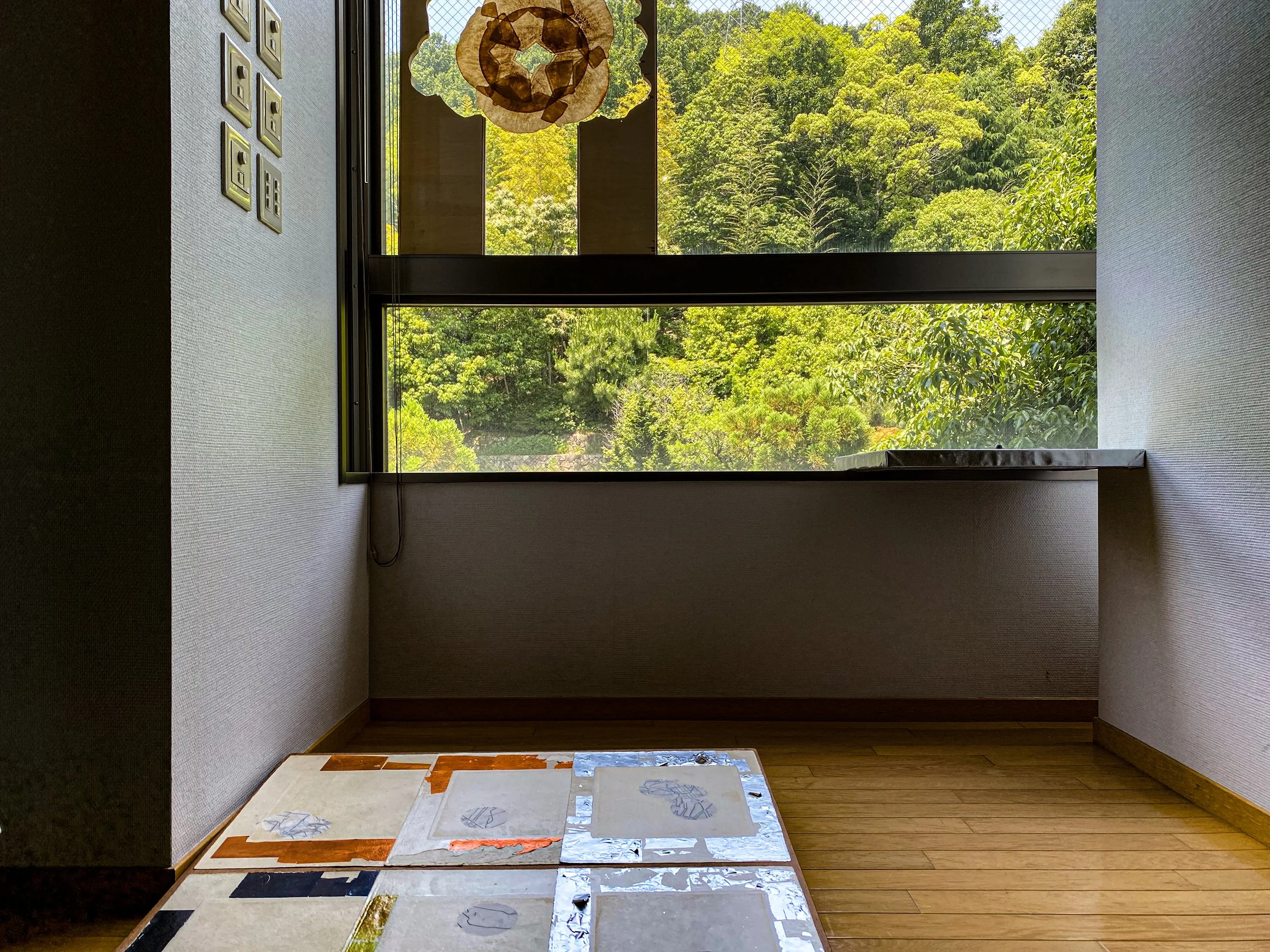 インスタレーションでは、窓や柱を敢えてフレーミングする手法により、内外の境界が流動的に変容する様相が強調された。時の経過とともに窓から差し込む日差しが、朝の鋭い影から午後の穏やかな光、曇天や雨天へと展示空間を刻々と変化させ、その過程で環境、素材、鑑賞者との間に絶え間ない対話が生まれた。窓越しに見える外の緑は、刻々と表情を変え、稲川の干渉としての創作物と自然のサイクルとの儚い交錯を映し出す背景となった。
