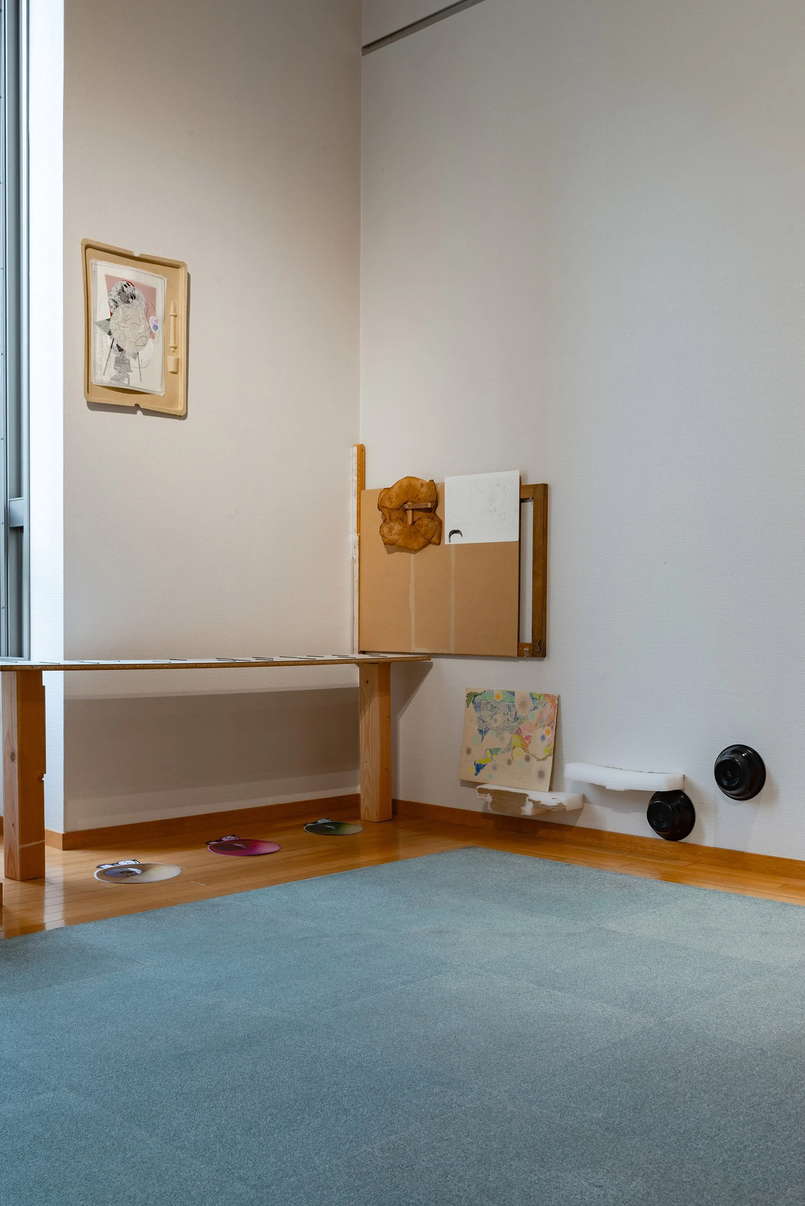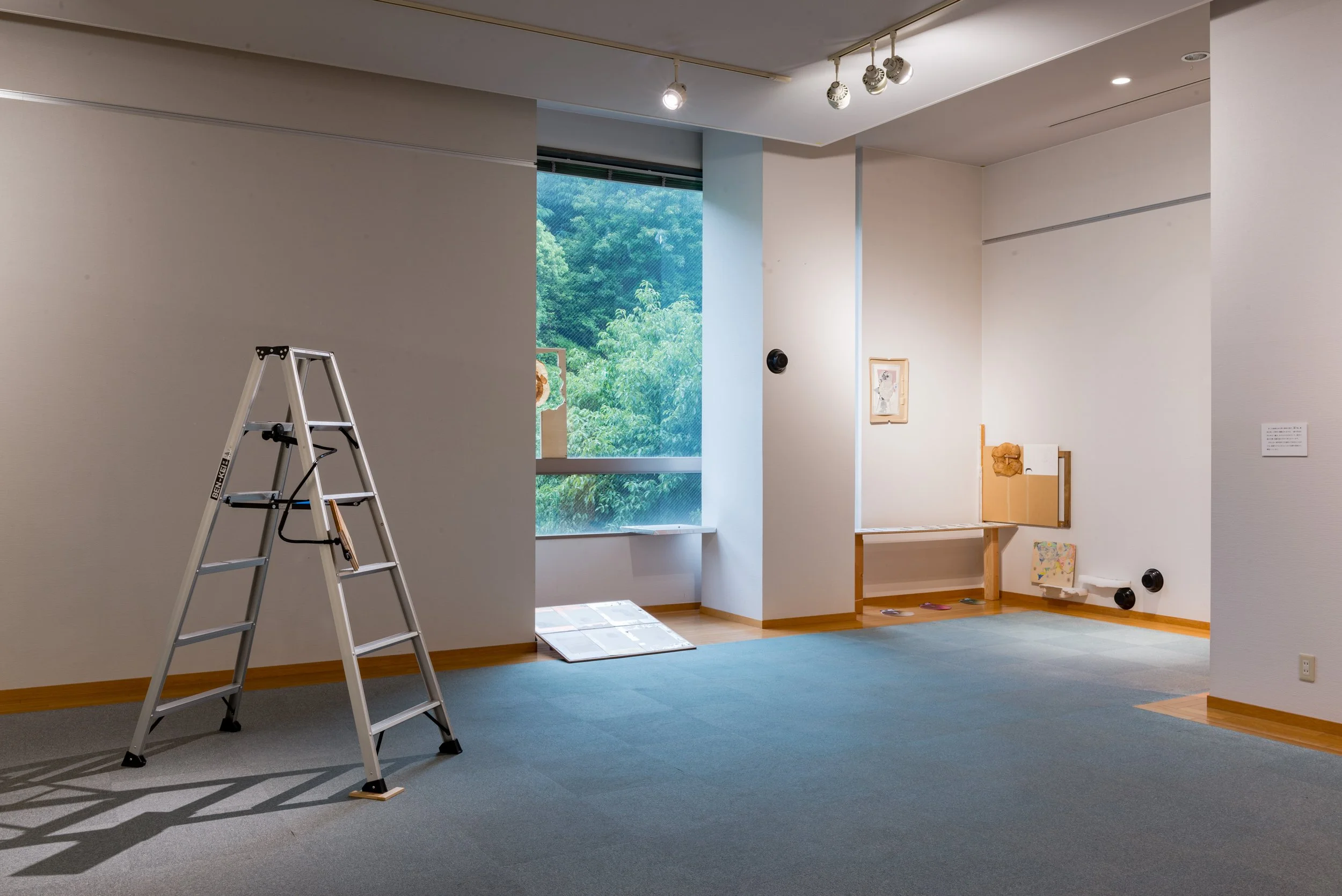 In this site-sensitive installation at Nakata Museum in Onomichi, Yutaka Inagawa assembled everyday remnants and personal artifacts stemming from his own consumption and daily life. These seemingly disparate objects – much like a random, flashback-like constellation of materials – were placed in a quiet corner of the gallery, activating the space in unexpected ways. The museum’s own stepladder and flexible-arm phone holder, along with used packaging and a plastic cup of soba noodles, served as humble foundational materials. Meanwhile, fragments of digital collages, drawings, and semi-abstract sculptural elements were arranged as enigmatic connectors that respond to shifts in the environment and time. Through his creative interventions, Inagawa blurs the boundary between artistic gestures and supportive fixtures, allowing these objects to function both as standalone works and as auxiliary structures.